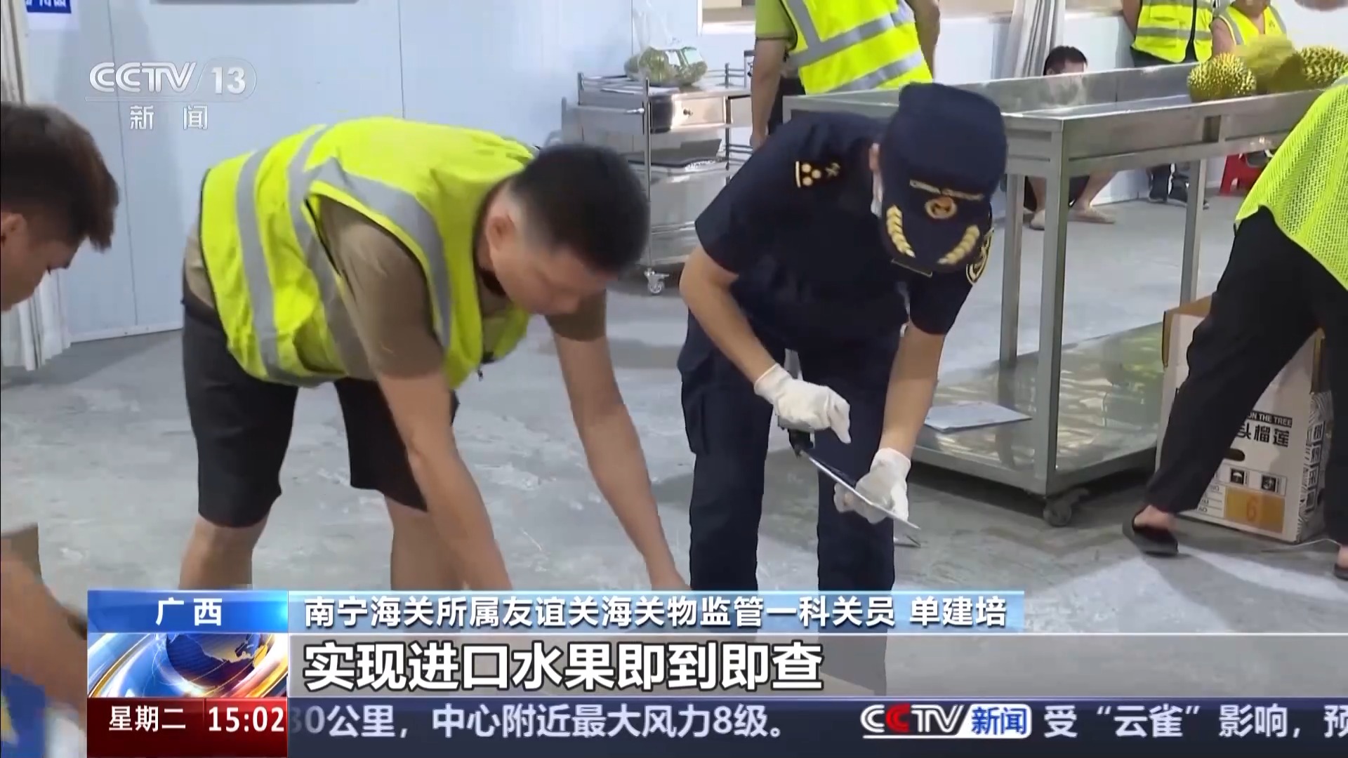 南寧海關所屬友誼關海關物監管一科關員 單建培:友誼關口岸是廣西最大的水果進口口岸,系統能自動識別查驗車位空閑狀態,自動通知車輛進場排隊,壓縮貨物等待時間20%,查驗車位周轉率提升35%,實現進口水果即到即查。
