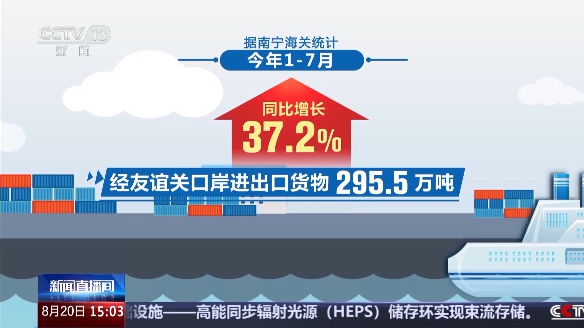 據南寧海關統計,1—7月,經友誼關口岸進出口貨物295.5萬噸,同比增長37.2%。其中對越南2128.5億元,同比增長28%。進出境車輛27.3萬輛次,同比增長17.1%。