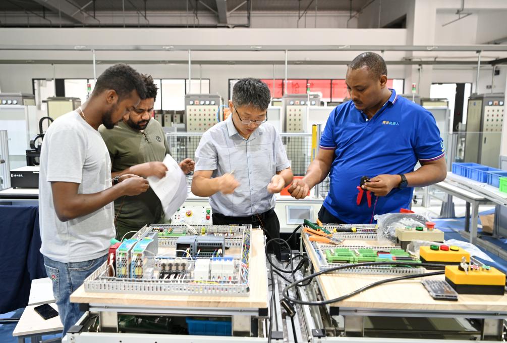 在天津職業(yè)技術(shù)師范大學(xué),老師帶領(lǐng)韓士蘭(右一)和其他留學(xué)生進行實訓(xùn)操作(2022年7月29日攝)。韓士蘭來自埃塞俄比亞,在天津?qū)W習(xí)期間,韓士蘭積極利用學(xué)校先進的職業(yè)教育實踐條件,專注于人工智能制造和工業(yè)機器人方向的研究。新華社記者李然 攝