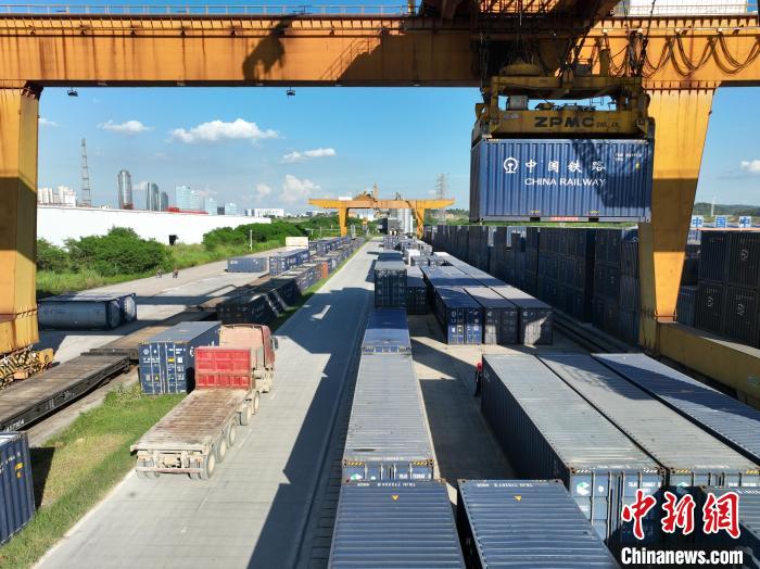 8月26日,廣西南寧國際鐵路港內,鐵路職工頂著下午的烈日,正在為發往越南的貨運班列裝卸貨物。該鐵路港是廣西始發中越班列的核心場站。國鐵南寧局提供的信息顯示,今年前7個月,廣西始發中越班列累計發運貨物6850標箱,同比增長16倍;其中7月份發運1922標箱,超過今年一季度發運量總和,為今年以來第三次刷新單月發運量紀錄。圖為集裝箱擺滿場站,等待裝車。王以照 攝