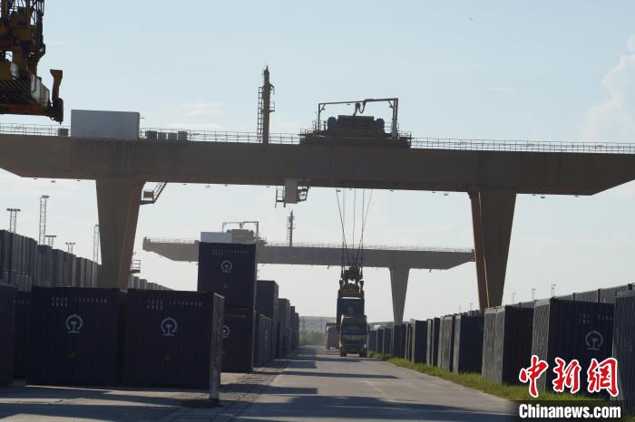 圖為龍門吊正將集裝箱從卡車轉移至中越貨運班列。 王以照 攝