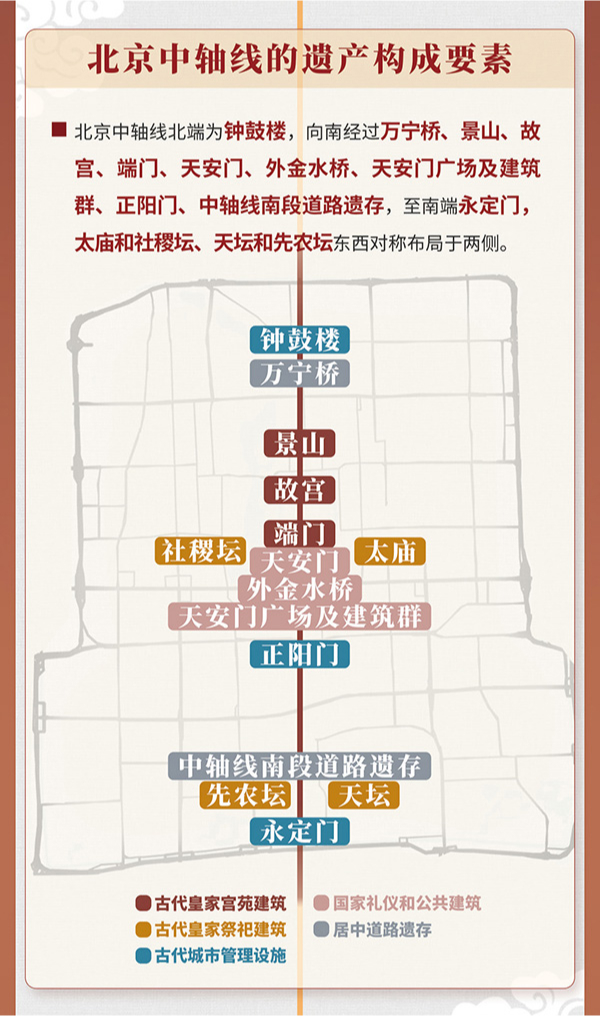 北京中軸線始建于元,成型、豐富于明清,發(fā)展、傳承于近現(xiàn)代,是逾7個(gè)世紀(jì)城市歷史遺存不斷累積疊壓的結(jié)果,成為北京老城獨(dú)特景觀秩序的極致體現(xiàn)。元至元四年(1267年)至明永樂三年(1405年),初步確立了北京中軸線的位置與基本形態(tài)。明永樂四年(1406年)至明嘉靖四十三年(1564年),北京城形成“凸”字形城郭格局,北京中軸線的整體格局基本形成?,F(xiàn)存古代皇家宮苑、祭祀建筑和城市管理設(shè)施均始建于這一時(shí)期。明嘉靖四十四年(1565年)至1911年,北京中軸線的整體格局得以保持和延續(xù),清乾隆年間對(duì)北京城規(guī)劃格局的調(diào)整與完善,進(jìn)一步豐富與加強(qiáng)了中軸線的景觀秩序。1912年以后,原有服務(wù)于皇權(quán)的儀式性空間轉(zhuǎn)變?yōu)榉?wù)公眾的開放空間。中華人民共和國成立后,天安門廣場(chǎng)的規(guī)劃與建設(shè)延續(xù)并強(qiáng)化了中軸線居中、對(duì)稱的規(guī)劃格局,北京中軸線作為北京城市發(fā)展的基準(zhǔn)線仍然發(fā)揮著統(tǒng)領(lǐng)性作用。