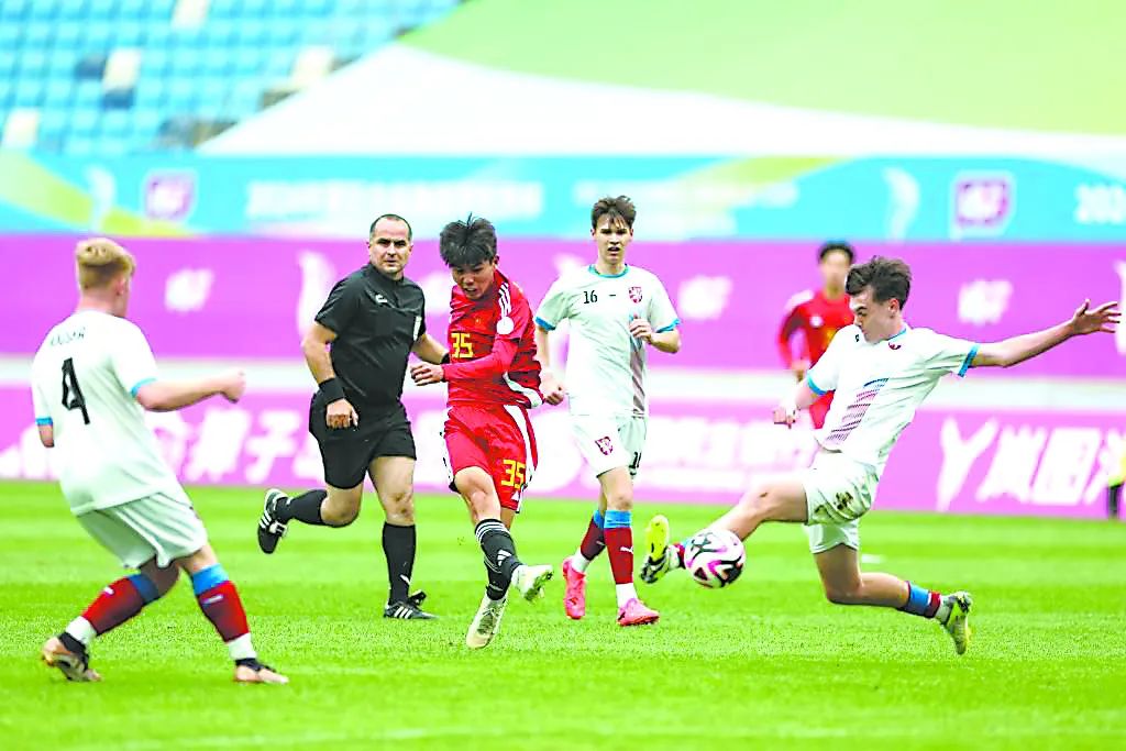 2024年國際中學生體育聯合會足球世界杯在遼寧省大連市舉行,中外球員角逐綠茵場。 遼寧省教育廳供圖