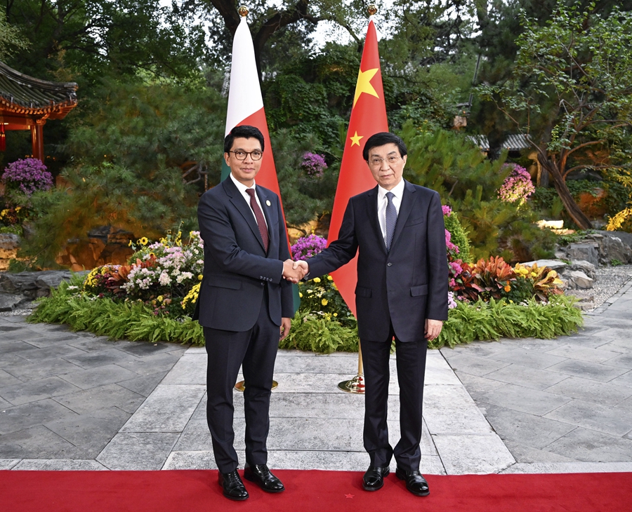 9月6日,全國政協主席王滬寧在北京會見來華出席中非合作論壇北京峰會的馬達加斯加總統拉喬利納。新華社記者 申宏 攝