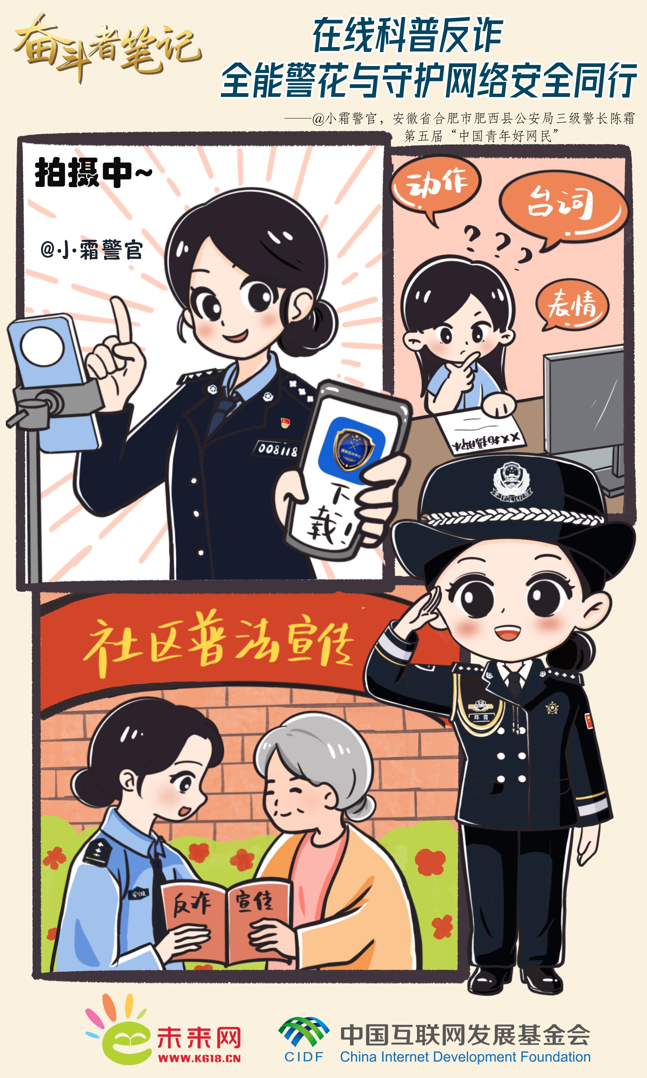 在線下,陳霜積極參加反詐宣傳活動(dòng),走進(jìn)社區(qū)、學(xué)校,面對(duì)面為百姓講解反詐技巧,讓反詐宣傳更加深入人心。她還出現(xiàn)在央視《社會(huì)與法》、共青團(tuán)中央《團(tuán)團(tuán)微課:青少年網(wǎng)絡(luò)素養(yǎng)公開課》等節(jié)目錄制現(xiàn)場(chǎng),以及中國(guó)網(wǎng)絡(luò)文明大會(huì)、中國(guó)網(wǎng)絡(luò)視聽大會(huì)等會(huì)議活動(dòng)中,分享交流寶貴經(jīng)驗(yàn),借助大平臺(tái)影響力不斷拓寬新媒體時(shí)代反詐宣傳新陣地,為構(gòu)建更加安全的網(wǎng)絡(luò)環(huán)境貢獻(xiàn)著青春力量。