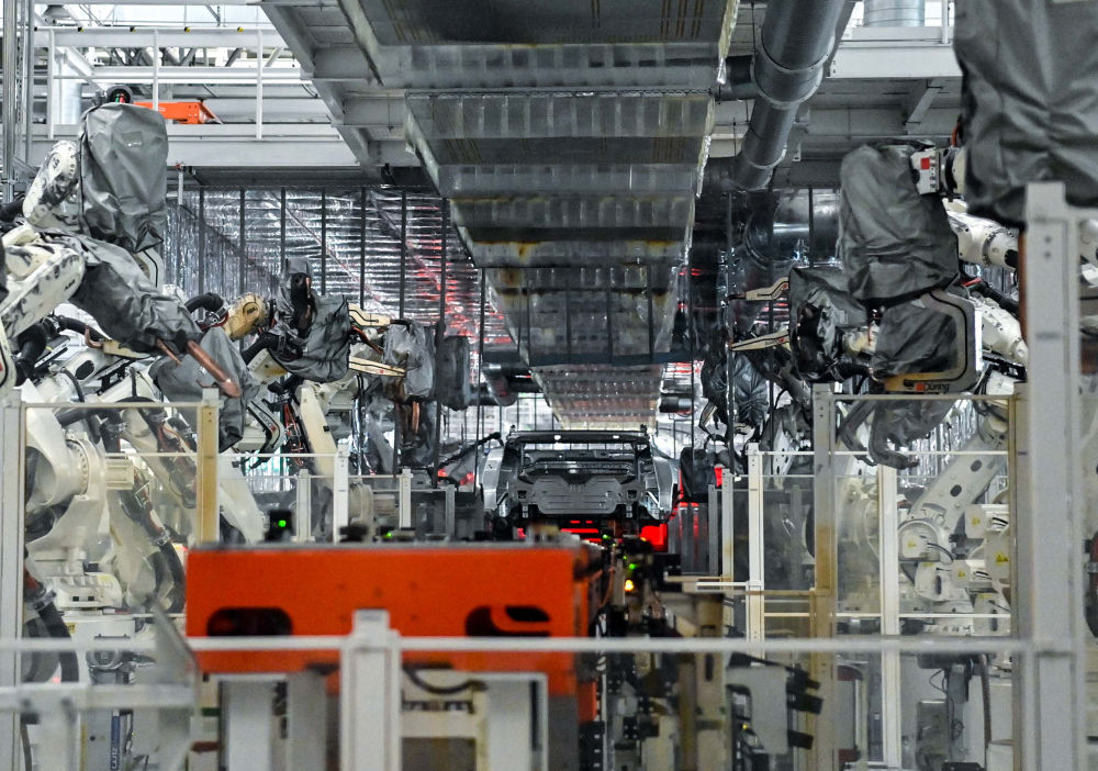 8月5日,在位于吉林省長春市一汽紅旗制造中心繁榮廠區的焊裝車間內,焊裝機器人在生產線上焊接車身。新華社記者 顏麟蘊 攝