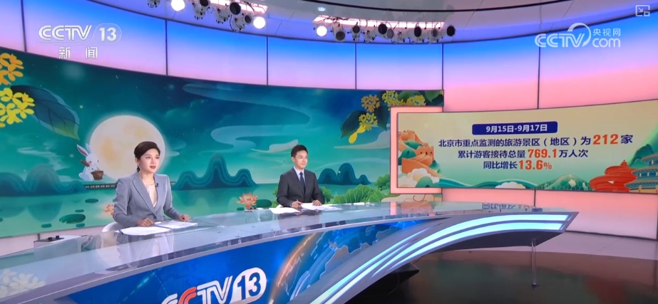 通過數據盤點各地出游的情況,北京市文旅局統計,9月15日至17日,北京全市重點監測的旅游景區(地區)為212家,累計游客接待總量769.1萬人次,同比增長13.6%,比2019年增長1.4倍。