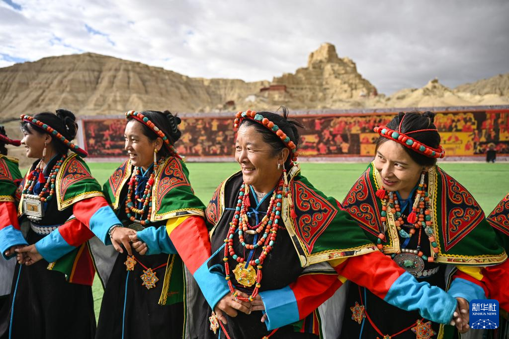 在西藏阿里地區札達縣古格王國遺址腳下,當地村民表演“宣舞”后互相交流(9月11日攝)。