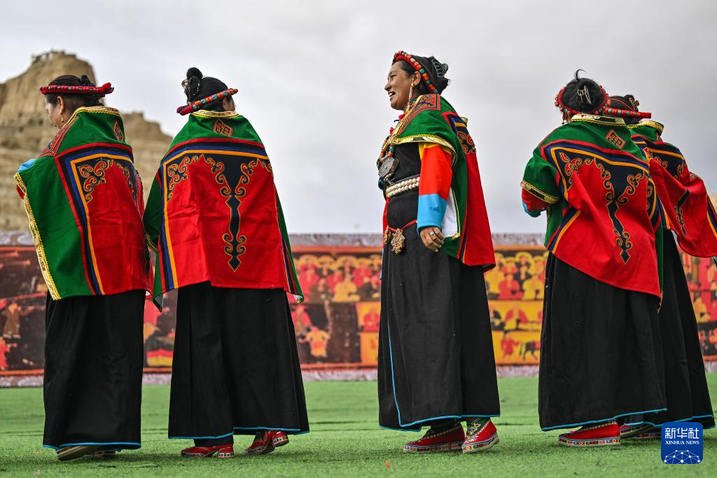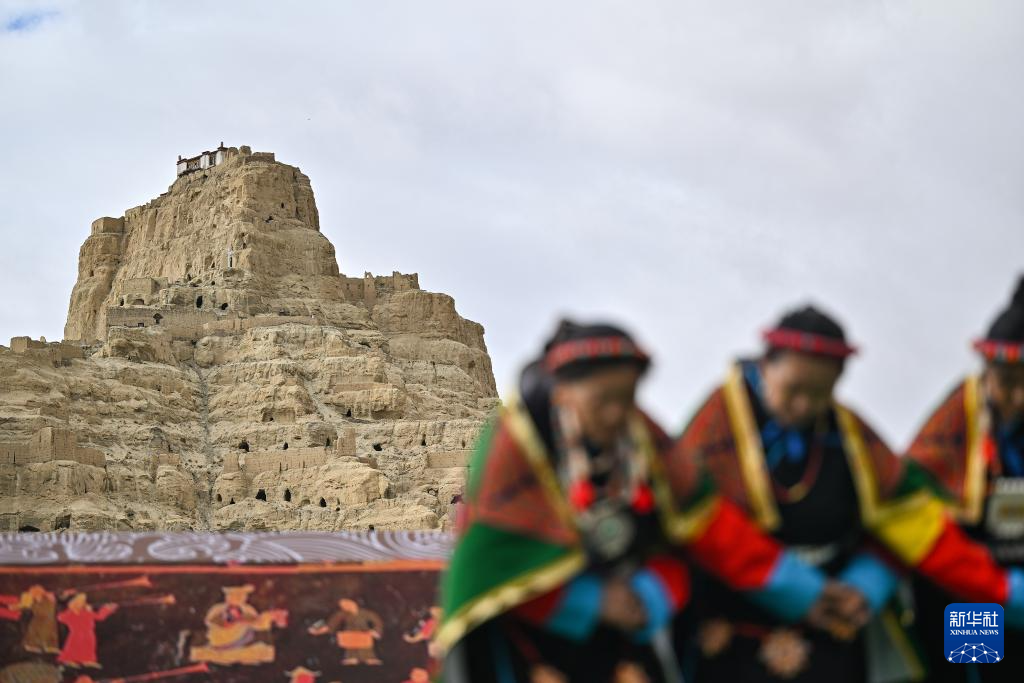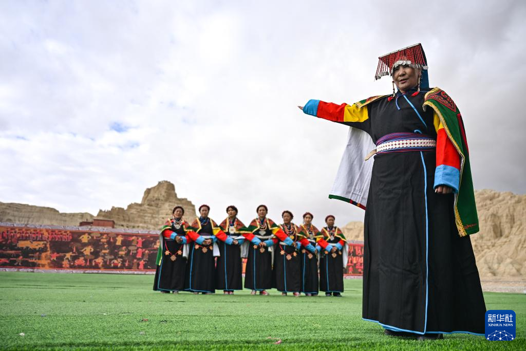 在西藏阿里地區札達縣古格王國遺址腳下,當地村民表演“宣舞”(9月11日攝)。