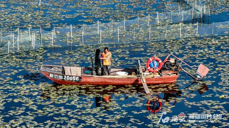 9月20日,養(yǎng)殖戶在博斯騰湖上捕撈螃蟹(無(wú)人機(jī)攝)。石榴云/新疆日?qǐng)?bào)記者 周鵬攝