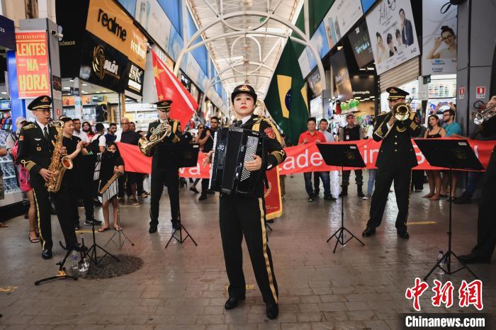 當(dāng)?shù)貢r間9月21日,巴西首都巴西利亞,參加中國軍事文化周活動的中國人民解放軍軍樂團演出分隊,正在巴西利亞小商品市場演出。琚振華 攝