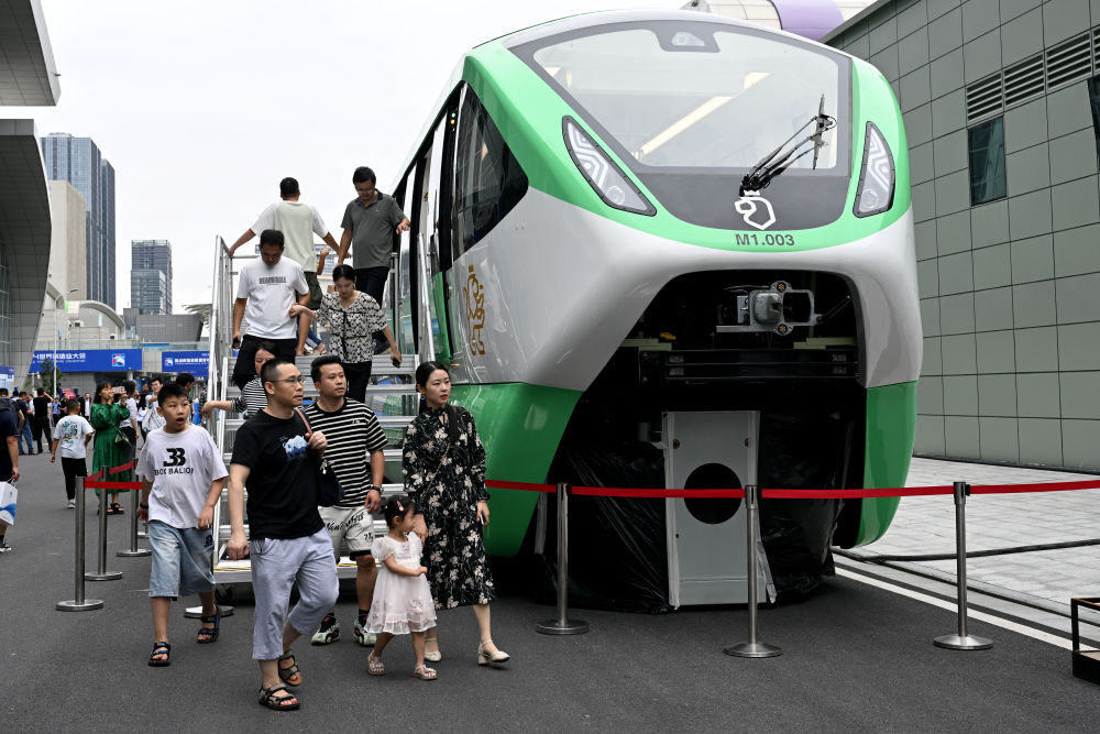 9月21日,在2024世界制造業大會上,人們參觀體驗一款跨座式單軌列車。新華社記者 黃博涵 攝