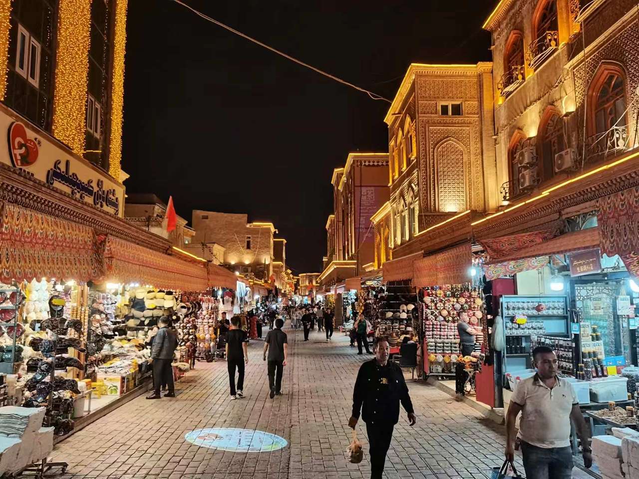入夜,漫步在新疆喀什古城,各色燈光打在土黃主色調的墻體,勾勒出溫暖柔和的光暈。傳統與“摩登”在這里碰撞,異域與本土風情在這里交融,“汗巴扎”夜市里各式各樣民族特色美食考驗著味蕾,各民族人們載歌載舞,共度屬于他們的歡樂時光。