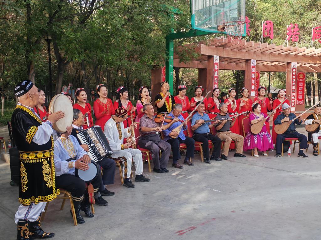 9月19日,庫爾勒市朝陽街道團(tuán)結(jié)社區(qū)“石榴籽藝術(shù)團(tuán)”團(tuán)長(zhǎng)卡得爾·克衣木正帶著團(tuán)員們?yōu)榫用癖硌荨P氯A社記者顧煜 攝