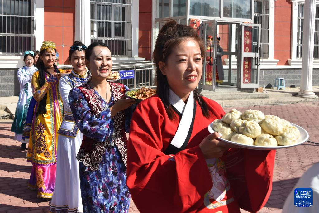 9月27日,在新疆塔城市新城街道哈爾墩社區舉行的“鄰里節百家宴”現場,社區居民展示自己制作的美食。