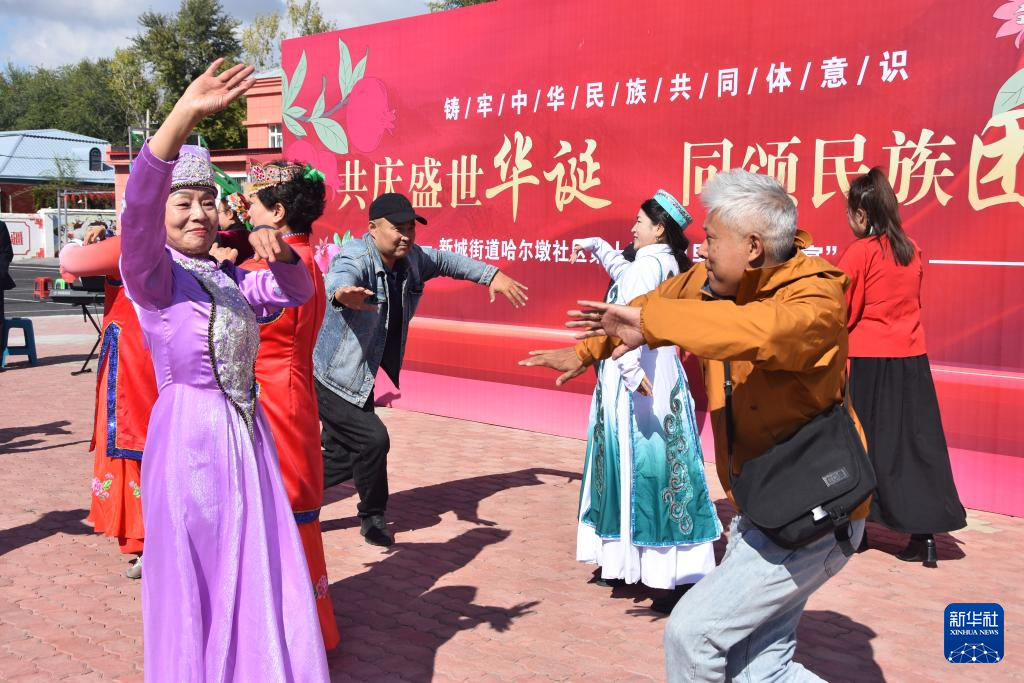 開闊的社區大院內,數十名各族群眾圍坐長桌旁,一邊品嘗各色美食,一邊欣賞居民的精彩表演,歡聲笑語不時傳出。這是新疆塔城市新城街道哈爾墩社區舉行的“鄰里節百家宴”,各族群眾展示民族歌曲,跳起歡快的舞蹈。