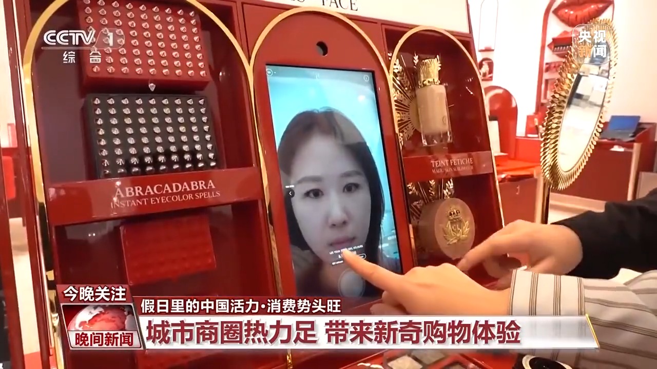在四川成都,一家大型商場的裸眼3D大屏換上了國慶新裝,身臨其境的原始森林、被滿天繁星包裹,吸引了許多游客前來打卡。現場更有虛擬試妝、虛擬試鞋、智能導購等等前沿科技帶來的新奇購物體驗。