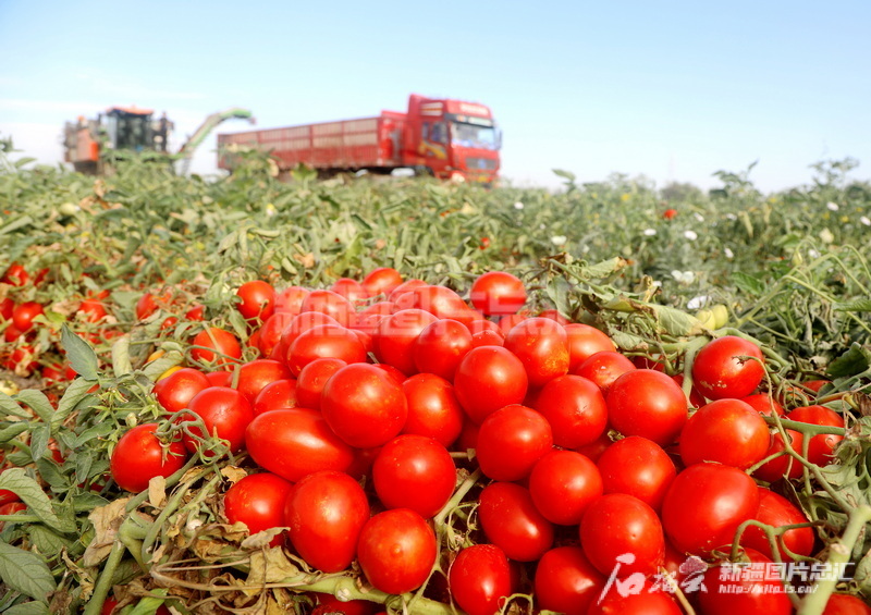 2024年8月15日,在新疆生產建設兵團第六師101團一塊農田里,職工采用機械收獲加工番茄。魏新江攝