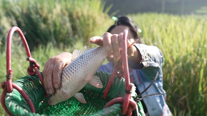 而侗族人民的智慧遠(yuǎn)不止于此,他們巧妙地利用當(dāng)?shù)刈匀画h(huán)境,孕育出獨(dú)特的“稻魚鴨”共生稻作文化。從江縣往洞鎮(zhèn)增沖種植養(yǎng)殖專業(yè)合作社負(fù)責(zé)人石剛勇說,“種植一季稻、放養(yǎng)一批魚、飼養(yǎng)一批鴨,稻魚鴨系統(tǒng)能夠和諧共存,是因為打了時間差。種稻的時候放魚苗,魚苗能清理土壤,讓土壤疏松。等到農(nóng)歷的三月下旬或四月上旬,再放入鴨苗。此時的秧苗已經(jīng)長成,剛出生不久的鴨苗不會損壞秧苗,鴨子吃田里的蟲子,它們的糞便喂魚,魚糞又滋養(yǎng)稻谷,這就形成了一個完美的生態(tài)循環(huán)。”