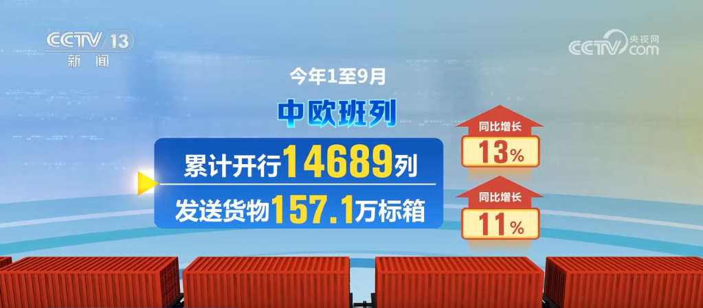 數據顯示,今年1至9月,中歐班列累計開行14689列,發送貨物157.1萬標箱,同比分別增長13%、11%。其中9月份開行1633列,發送貨物17.1萬標箱,同比分別增長15%、12%。