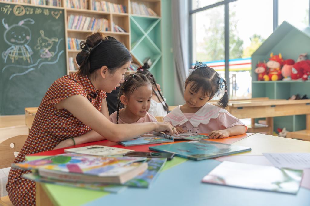 2024年9月25日,在重慶市江津區珞璜鎮碑亭社區,社區居民郭明會(左一)帶著小孩閱讀用社保卡借閱的圖書。新華社記者 黃偉 攝