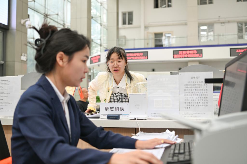 2024年8月12日,在哈爾濱新區社保綜合服務大廳,工作人員(左)在辦理業務。新華社記者 王松 攝