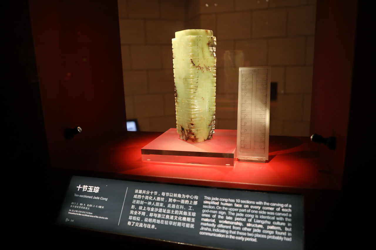 金沙遺址博物館鎮館之寶之一——十節琮,高22.2厘米,全器分十節,每節有四個簡化的神人面紋,在上端的一面還陰刻有一神人圖案。這件玉琮的質地與金沙遺址的其他玉琮完全不同,其造型風格、紋樣圖案、制作工藝都與長江下游的良渚文化一致,應是早于金沙1000多年的良渚人的產品。圖片由金沙遺址博物館提供