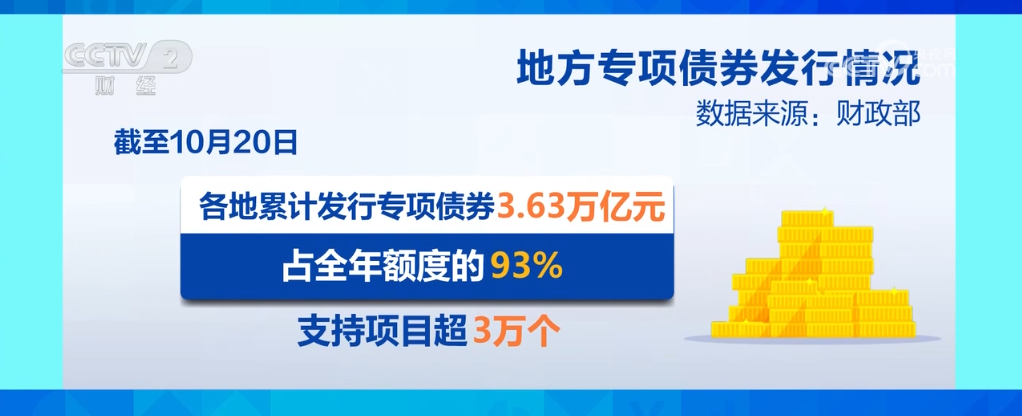 數(shù)據(jù)顯示,9月份,全國一般公共預(yù)算支出、政府性基金預(yù)算支出同比分別增長(zhǎng)5.2%和34.2%。同時(shí),地方專項(xiàng)債券發(fā)行加速,9月發(fā)行約占全年額度的26%。截至10月20日,各地累計(jì)發(fā)行專項(xiàng)債券3.63萬億元,占全年額度的93%,支持項(xiàng)目超3萬個(gè)。