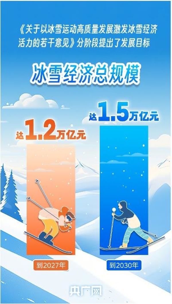 近日,國務院辦公廳公開發布《關于以冰雪運動高質量發展激發冰雪經濟活力的若干意見》(以下簡稱《意見》),分階段提出發展目標:到2027年,冰雪運動場地設施更加完善,服務水平顯著提升,冰雪運動更加廣泛開展,冰雪經濟總規模達1.2萬億元。到2030年,冰雪經濟主要產業鏈條實現高水平協調融合發展,冰雪消費成為擴大內需的重要增長點,冰雪經濟總規模達1.5萬億元。