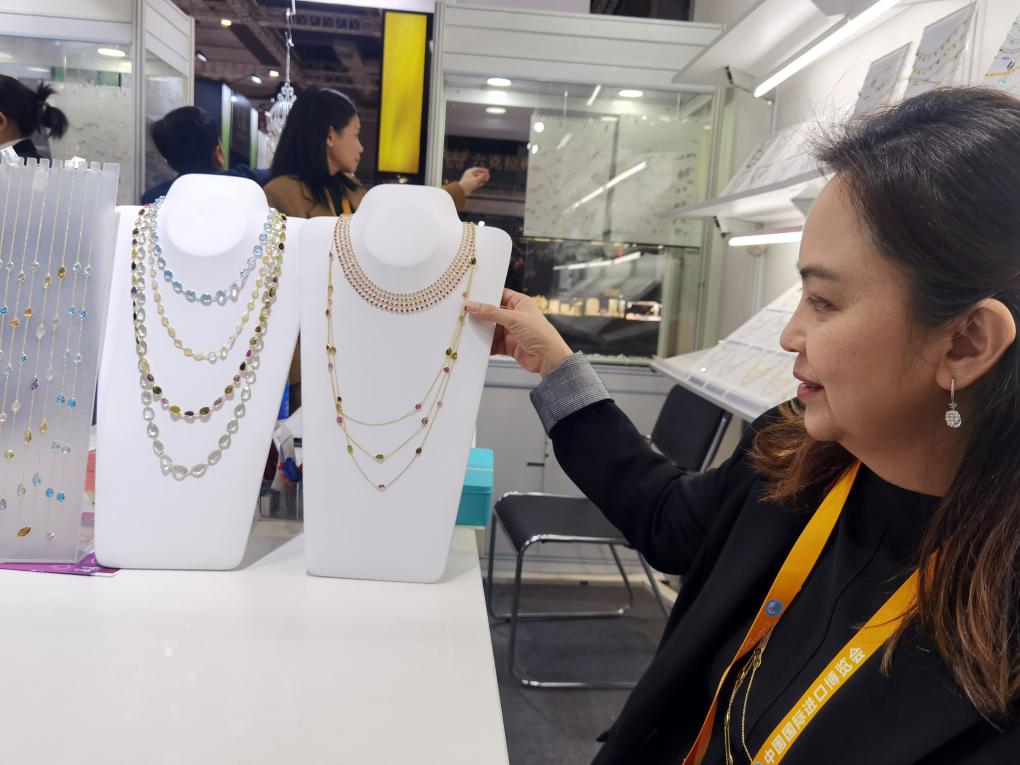 11月7日,首次參展進博會的阿拉尼婭在介紹展位上的珠寶首飾。 新華社記者 許曉青 攝