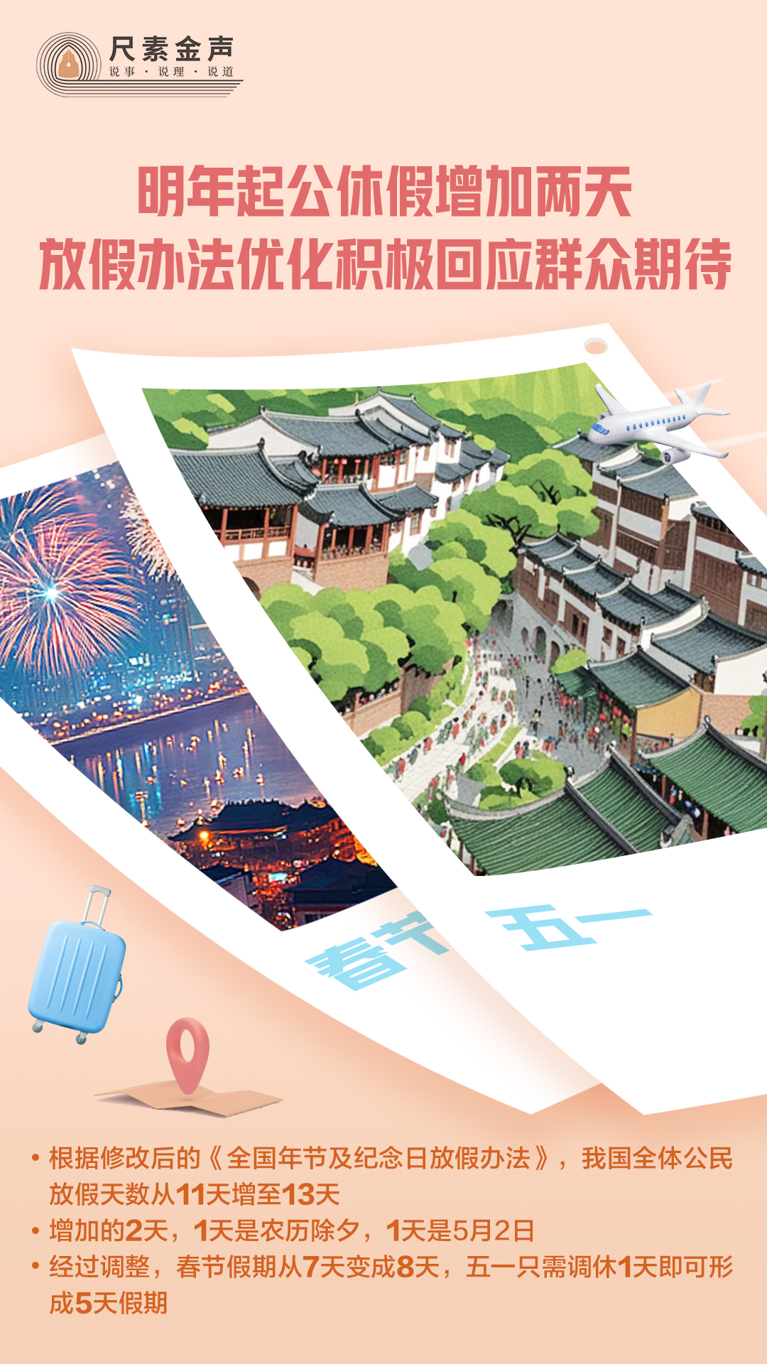 近日,國務院公布《關于修改<全國年節及紀念日放假辦法>的決定》,并公布2025年部分節假日安排。“每年多放兩天假”“抓緊買好機票準備出游”……消息剛一發布,便受廣泛關注。