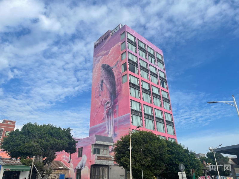 紅海灣開發(fā)區(qū)遮浪街道水龜寮村海濱街建筑外立面的“夢境鯨山”畫作(央廣網(wǎng)見習記者 張順鵬 攝)