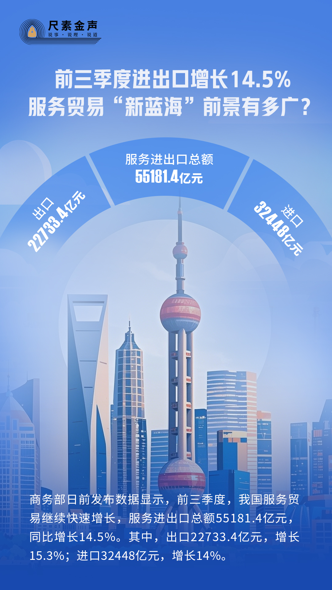 商務部日前發布數據顯示,前三季度,我國服務貿易繼續快速增長,服務進出口總額55181.4億元,同比增長14.5%。其中,出口22733.4億元,增長15.3%;進口32448億元,增長14%。