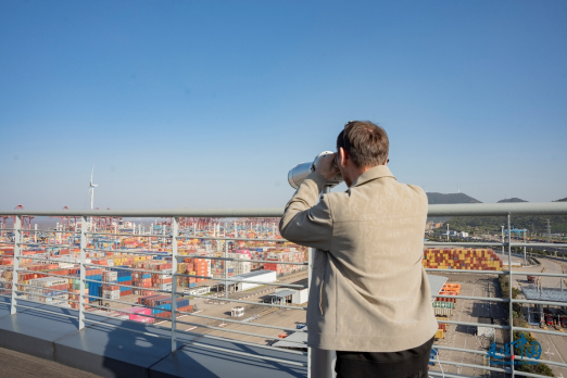 記者們站在觀景平臺,通過望遠鏡親眼見證了全球最繁忙集裝箱港口之一的現(xiàn)代化作業(yè),他們爭相與壯觀的碼頭場景合影留念。來自哈薩克斯坦《誠實報》社會文化部主任納烏雷茲別克·薩爾沙耶夫在接受環(huán)球網(wǎng)記者采訪時說道“寧波舟山港的運作效率和智能化管理令人贊嘆,它無疑是全球物流行業(yè)的標桿。”