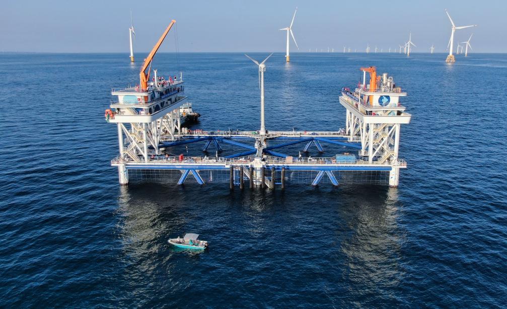 這是中廣核“伏羲一號(hào)”風(fēng)漁融合網(wǎng)箱平臺(tái)(無(wú)人機(jī)照片)。新華社記者鄧華 攝