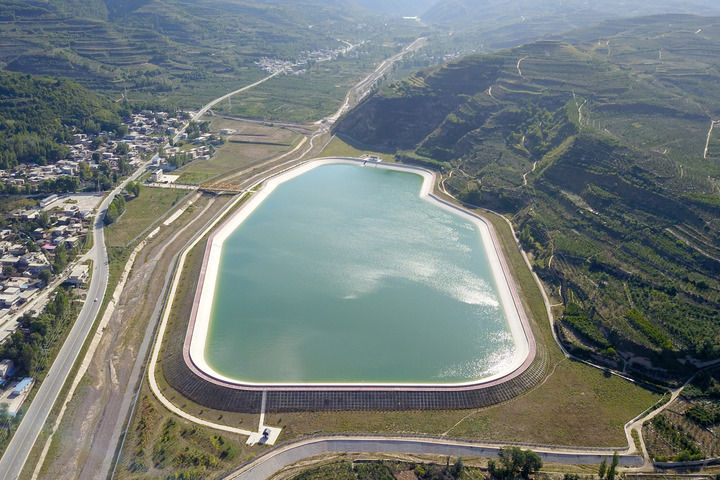 在甘肅省天水市拍攝的引洮供水工程楊家灣調蓄水池(2021年9月8日攝,無人機照片)。