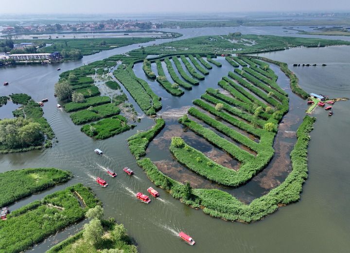 游船在河北雄安新區白洋淀內游覽(2024年5月8日攝,無人機照片)。