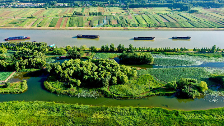 這是在山東省棗莊市臺兒莊區拍攝的大運河國家文化公園(棗莊段)兩岸景色(2023年8月9日攝,無人機照片)。