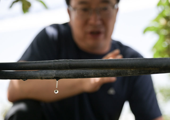 在陜西省延安市洛川縣槐柏鎮度古村“飛天”蘋果基地灌溉示范點,節水滴灌系統為果樹灌溉(2024年6月23日攝)。