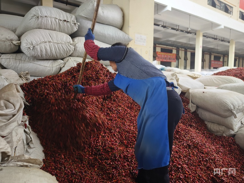 工人正在對辣椒進行堆積,等待分裝(央廣網記者 欒小琳 攝)