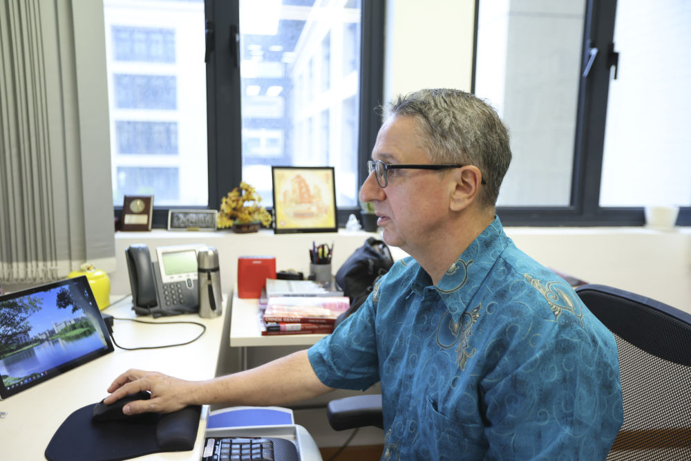 2024年11月14日,澳門大學(xué)社會科學(xué)學(xué)院副教授、來自美國的托德·萊爾·桑德爾(中文名申大德)在辦公室工作。新華社記者 梁家駿 攝