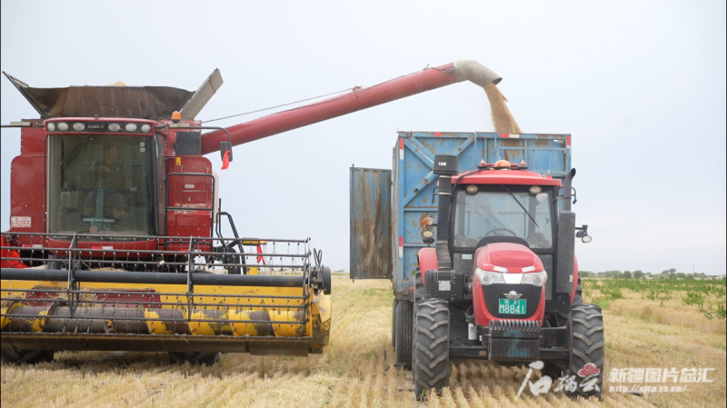 6月5日,喀什地區麥蓋提縣新疆五征綠色農業發展有限公司在塔克拉瑪干沙漠邊緣種植的6000余畝冬小麥收獲場景(資料圖)。買熱古·買買提攝