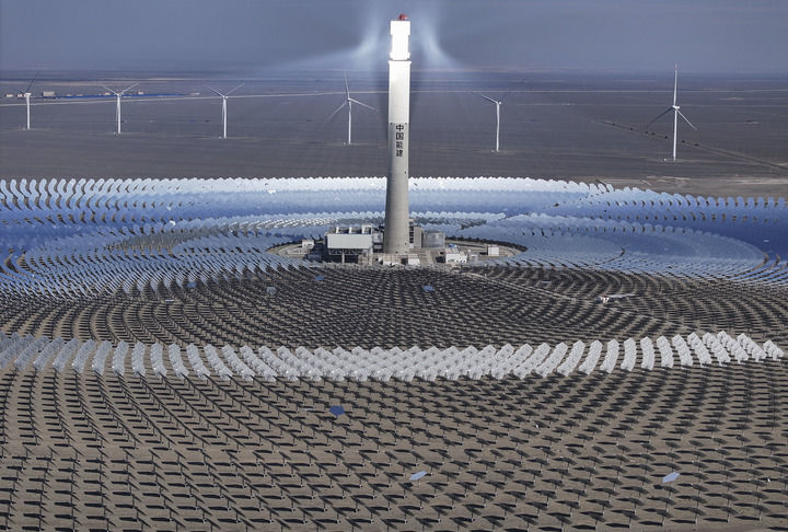 這是2024年9月12日在新疆哈密市伊吾縣淖毛湖鎮拍攝的國家光熱示范項目——熔鹽塔式50兆瓦光熱發電站(無人機照片)。 新華社記者 胡虎虎 攝