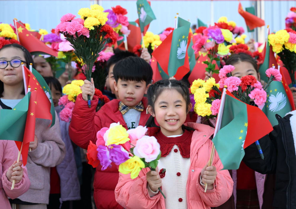 在澳門(mén)國(guó)際機(jī)場(chǎng),澳門(mén)警察樂(lè)隊(duì)奏響熱情洋溢的歡迎曲,舞龍舞獅表演喜氣歡騰。數(shù)百名澳門(mén)青少年和各界群眾代表?yè)]動(dòng)國(guó)旗、特別行政區(qū)區(qū)旗和鮮花,表達(dá)熱烈的歡迎。
