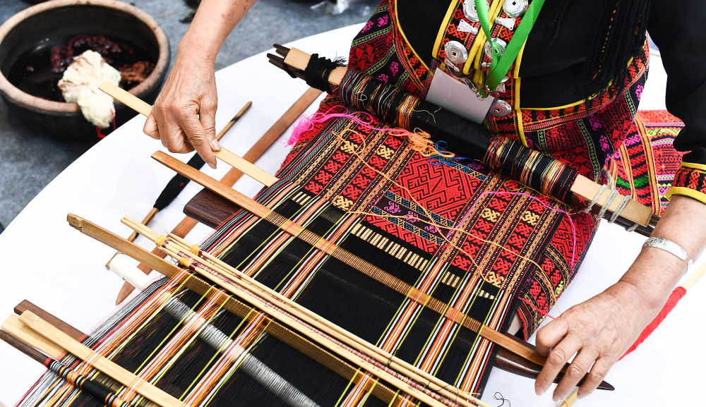 在2023海南錦繡世界文化周非物質文化遺產傳統織繡印染技藝項目精品展上,手工藝人在編織黎錦(2023年4月30日攝)。新華社記者 楊冠宇 攝