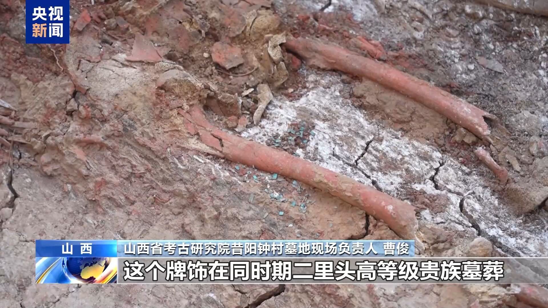 山西省考古研究院昔陽鐘村墓地現場負責人 曹俊:扇貝覆面這種喪葬習俗,目前是從先商,大概是二里頭四期,一直到商代晚期有使用。男性墓主人右側股骨位置,有一個由綠松石的小碎片,嵌片組成的一個綠松石牌飾。這個牌飾在同時期二里頭高等級貴族墓葬才隨葬的。我們經過綠松石礦源的檢測分析,初步判斷綠松石的礦源來自 東秦嶺地區。這件綠松石牌飾的出土表明它與二里頭之間很可能存在很密切的文化交流的關系。