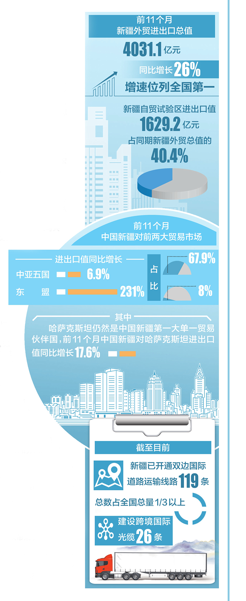 新疆自貿試驗區賦能效應持續顯現。烏魯木齊海關數據顯示,前11個月,新疆自貿試驗區進出口值1629.2億元,占同期新疆外貿總值的40.4%。