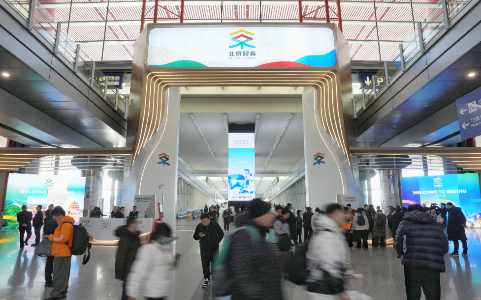 圖為2025年1月8日,在北京首都國際機場T3航站樓拍攝的“北京服務”機場服務點。從1月1日起,北京在首都國際機場和大興國際機場的國際到達出口設立“北京服務”機場服務點,為來華、來京外籍人士提供金融、通訊、交通、文旅等四個主題的20余項高頻服務,便利八方來客暢游中國。新華社發 (鞠煥宗攝)
