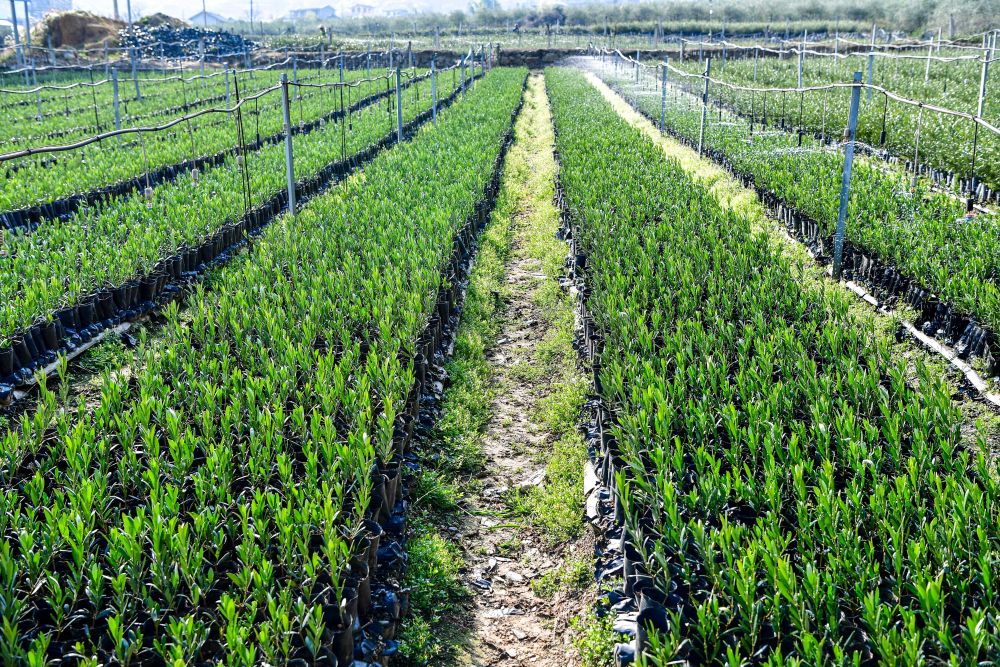 在四川冕寧縣元升油橄欖產業園,自動噴淋系統在為培育中的油橄欖樹幼苗澆水(2024年12月12日攝)。