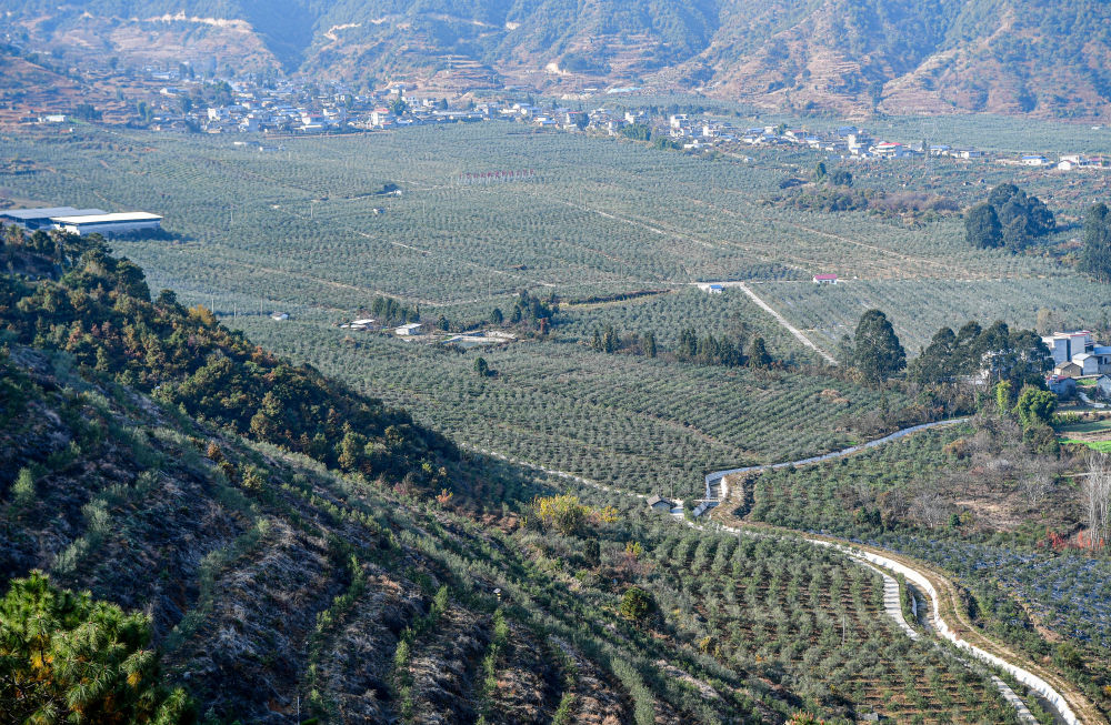 在四川冕寧縣宏模鎮油橄欖現代林業園區里,連片的油橄欖林形成產業規模效應(2024年12月12日攝)。